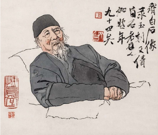 《速写因缘》还写到了黄永玉与齐白石的故事。图为黄永玉为九十四岁的齐白石创作的彩色肖像木刻,上面还有齐白石的题字。黄永玉至今珍藏,挂在他家客厅里。