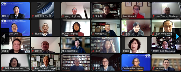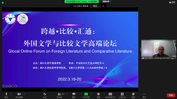 3月18日至20日,由浙江大学外语学院主办,中世纪与文艺复兴研究中心承办,《浙江大学学报(人文社会科学版)》协办的“跨越·比较·汇通:外国文学与比较文学高端论坛”在线上举行。哥伦比亚大学教授Jean E. Howard、香港城市大学教授张隆溪、中国人民大学教授杨慧林、上海交通大学教授王宁、四川大学教授曹顺庆、中国社会科学院研究员陈众议、北京外国语大学教授金莉、上海外国语大学教授查明建、中康涅狄格州立大学教授Candace Barrington等近四十位国内外专家学者应邀参与了论坛。浙江大学副校长何莲珍为论坛开幕式致辞。浙江大学文科资深教授许钧担任论坛的学术委员会主席。会议于18日下午、19日上午和下午共举行了三场论坛,二十四位与会学者做了主题发言。会议同期在B站进行了直播,四千多人次在线聆听,惠及校园内外。