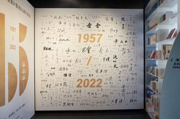 展览入口处,一面巨大的作家签名墙,一个个熟悉的名字见证了《收获》对中国文学的贡献。1957年,巴金、靳以主编的大型文学刊物《收获》在上海诞生,一代代收获人延续五四新文化血脉,坚守文学独立品格,“把心交给读者”。展览首个板块——“《收获》与巴金”中,读者将看到《收获》杂志的创刊号和复刊号,巴金为《收获》写下的文字,《收获》编辑部的老照片和生动感人的视频资料。