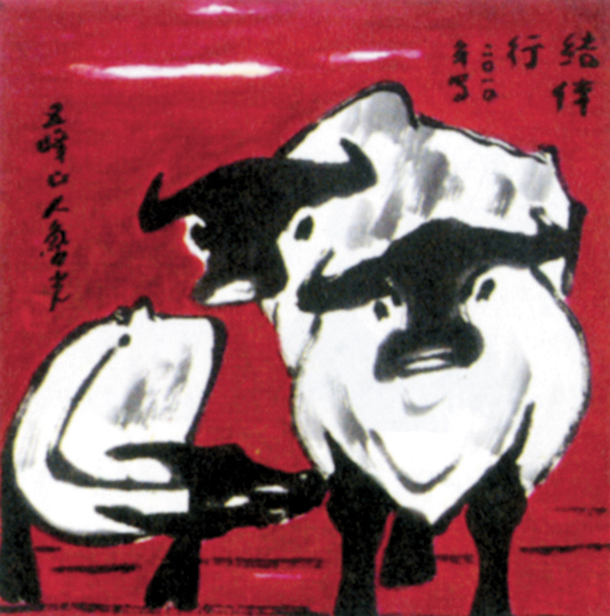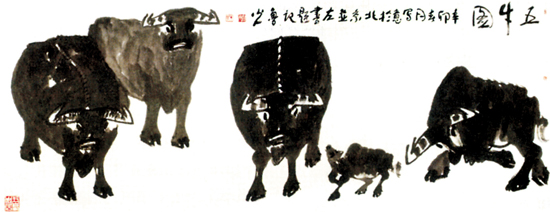 我不再满足于像与不像,而是追求神似。不管黄牛、水牛、牦牛、野牛,到了我笔下都只不过是一种符号,寓寄我对牛的理解,对牛的情感,也是诠释人生理念和追求的一种艺术符号。画牛时,我更倾向于写意。着眼于变形夸张,以达到神似的境界。我常在牛画上作题跋:老牛匆匆,不问西东,只顾耕耘,管它耳风。站着是条汉,卧下是座山。牛有二劲,任劲诚可贵,犟劲更难得。