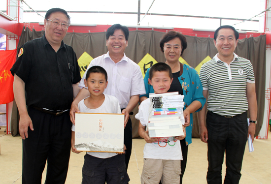 图为高洪波、张桐胜等向太阳村的孩子们捐赠图书。