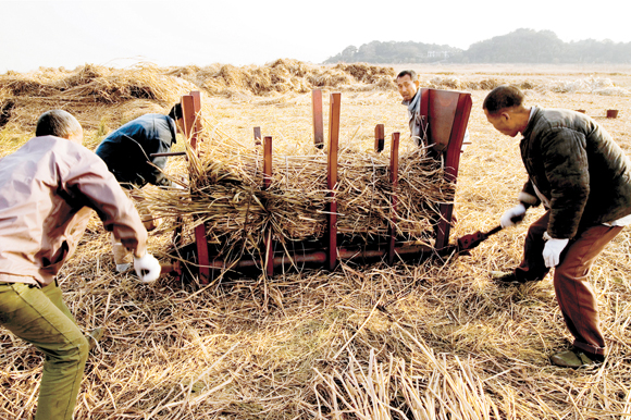 800里洞庭湖洲,几十万亩芦苇,1台扎苇机,6个扎苇汉子1组,每天干上10多个小时,每人每天挣15元钱,芦苇荡中砍苇人每年生存期仅有6个月