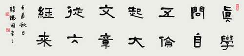瑞田的字是典型的文人书法,是一种有学养、境界的“雅”字。他的书法不是以横空出世的才华、气韵取胜,而是以境界和秀美取胜。他的书法,尤其是隶书,有三大特点:一是方正内敛,与一般以扁取胜、以大幅度的昂头翘尾取胜的隶书多有不同;二是他以典雅、古秀取胜,精致、秀气、内劲外雅,有一种上层士大夫的高贵之气;三是书法中含有金石味,那是他取法“毛公鼎”上的铭文、散氏盘等金属钟鼎器物上的金文所致。
