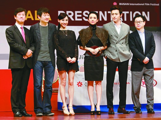 10月5日,韩国釜山电影节上,电影《危险关系》主创人员出席记者见面会,主演章子怡、张柏芝和张东健悉数出席。