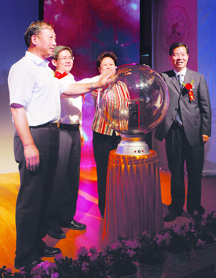 与会领导为画展开启水晶球(左起:张志学、郑泽光、王慧芬、李世贵)