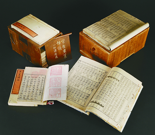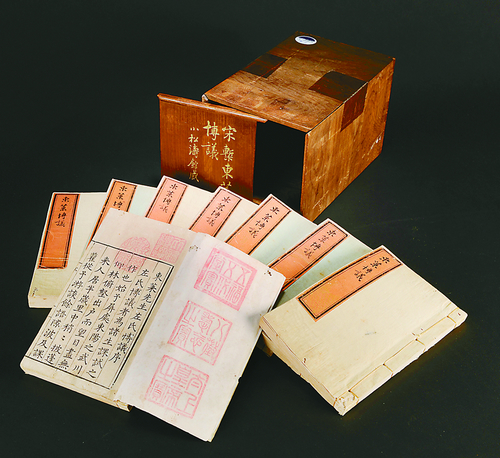 此批善本中亦有明清两代内府及藩府、王府刻书凡20余部,其中明代内府图书9部、清代顺治朝以至光绪朝刊印内府图书13部,藩府王府刻书各一部,均为刊印精美之作。确为难得的是其中一部明嘉靖六年(公元1527年)司礼监刻本、宋真德秀撰《大学衍义》四十三卷中,有明朝末代皇帝崇祯御批读书记一段,崇祯御批,为此仅见。“广韵楼”藏书中还有数部前清“天禄琳琅”遗珍传世。其中一部明嘉靖刻本宋吕祖谦《详注东莱先生左氏博议》一书附原装书箱,曾被视为宋版入藏清宫,乾隆五玺俱全,著录于《天禄琳琅后编》。书原装保存,书品完整,亦可堪称市场少有之珍品。