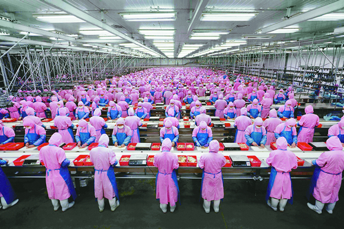 鸡肉加工厂工人们等距离地站在他们所专注的装满鸡块的红色托盘前,吉林,2005年