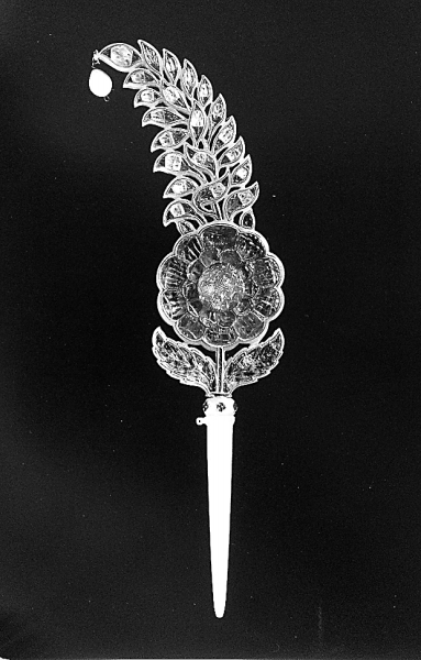与巨大的王座相比,一件不足20厘米的头巾饰品显得有点微不足道,但它却很有来头。头巾上的珠宝是王权真正的象征。在这件类似中国发簪的头巾饰品上,绿宝石、红宝石以及可能是黄晶的宝石经过切割,精确贴合每个叶片的形状,最多的一个叶片上有七颗小的红宝石。在镶嵌之前,叶脉已在成形的宝石上刻画出来。