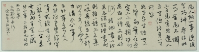 杜浩曾背临王羲之、王献之名帖,观者以为神肖酷似,这是杜浩长期以来伏案研读临写、体味描摹吟咏,自然而然的积累流露。杜浩在从事书法创作时,常常采用“二王”一路之笔锋兼用,灵活发挥笔触圆转方折、变化万端的妙处,且施法自然,姿态清新。近几年来,他不仅在笔势上取法王羲之的如龙变幻,又兼采赵孟頫的珠玉琳琅,在字形上放手流变,长短欹侧生姿,既强调了纵势上的贯气,又密切了字与字之间的连绵态势,雄奇飞动,章法多变。