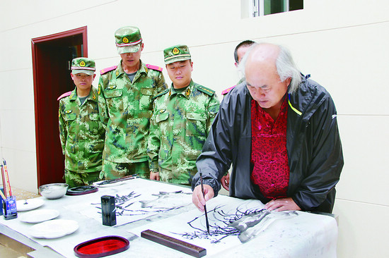 这厢演员们的演出获得良好反响,那厢书画家们的笔会交流也进入佳境。吴进良、张建豹、柳妍、陆海艇、谭军立、王献坤、方放、刘贞亮、田忠利等书画家们挥毫泼墨,与当地的书法家和书法爱好者以墨会友,交流技艺。吴进良创作的一幅《雪域昆仑》引得众人纷纷驻足,画家以雪、竹入画,呈现出高洁挺拔之感,吴进良说之所以创作这样一幅画作,是因为看到驻守边疆的战士们深有感触,也借此对他们扎根边疆的奉献精神表示敬意。和田地区文化馆馆长、兵团十四师美协主席曹建斌与北京的书画家共同创作了一幅《吉祥满园长寿图》,他表示很高兴也很荣幸,“通过交流学到了很多,画艺有所精进了”。让他更为高兴的是,当地画家以前多画油画,通过这样的交流现在不少画家也开始学画国画了,“这是个喜人的现象”。