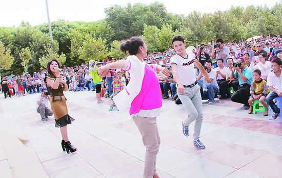高耸着毛主席与库尔班大叔握手雕像的新疆和田市团结广场上,欢声笑语、人潮涌动,高温并没有影响到人们欣赏节目的兴致,3000余名当地观众开怀地乐着、用力地鼓着掌,以此表达对节目的喜爱和演员的感谢;