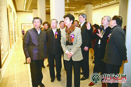 参加上海美术作品进京展开幕式的嘉宾兴致勃勃地参观画展
