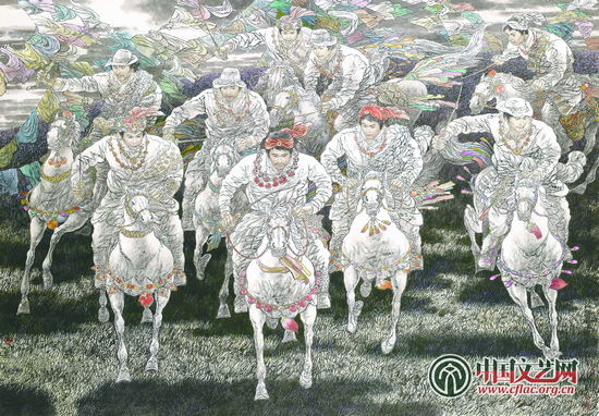 扬鬃奋蹄 藏族节日多,很多节日都会举办赛马会,届时草原上的牧民们骑着自家的骏马,身着艳丽的民族服装,参加赛马会。画面上一群威武彪悍的藏族小伙子骑着强壮的骏马你追我赶,扬鞭奋蹄,歌颂西藏人民自由自在的幸福生活。