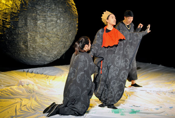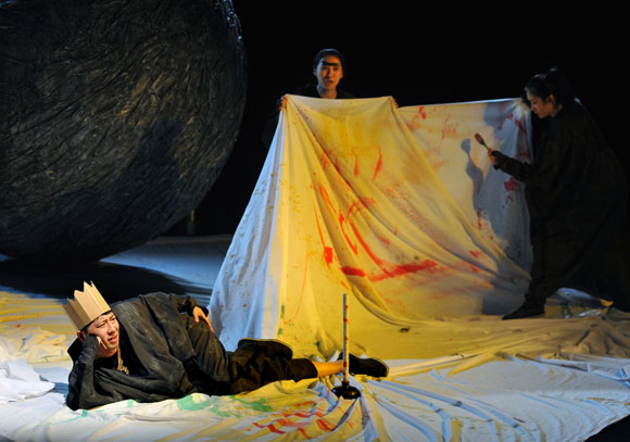这样一个复杂的充满了辩证思考的剧目,场景却并不复杂,带有后现代意味。一进场让人眼前一亮,一个巨大的银色球体悬挂于台中,变换着不同的投影场景,地上一块巨大的涂鸦的白布,十数个垂悬的铁通、衣架构成了概念化的舞台,随着剧情发展被赋予不同的意义。服装道具格外简单,五位演员统一的暗灰色袍裤,纸板剪出的王冠,马桶皮搋子当作宝剑,铁桶和抓起的白布就是一个个贵族臣民,等等,天马行空的创意令人会心一笑:创意至上,好的话剧无须借助过多华丽的道具。