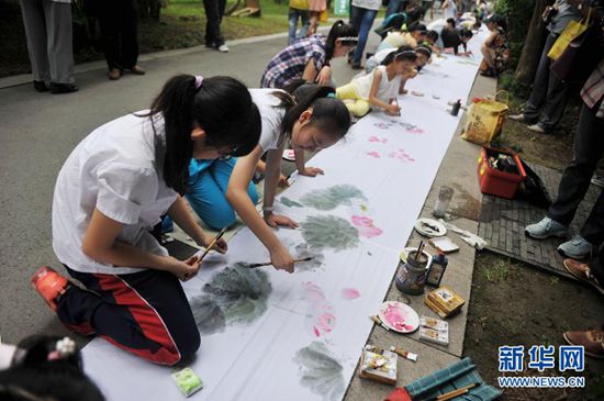 新华社照片,扬州(江苏),2014年6月28日 百米画卷庆祝大运河申遗成功 6月28日,孩子们在百米画卷上作画。当日,在江苏扬州茱萸湾公园内,百余名儿童在百米画卷上描绘自己心中的大运河,以此来庆祝大运河申遗成功。 新华社发(司新利 摄)