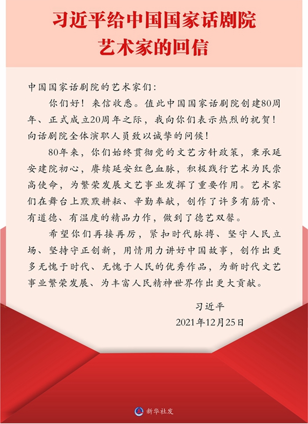 新华社北京12月25日电 在中国国家话剧院正式成立20周年之际,中共中央总书记、国家主席、中央军委主席习近平12月25日给国家话剧院的艺术家回信,向国家话剧院全体演职人员致以热烈的祝贺和诚挚的问候。