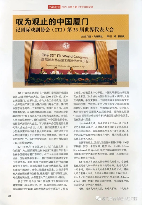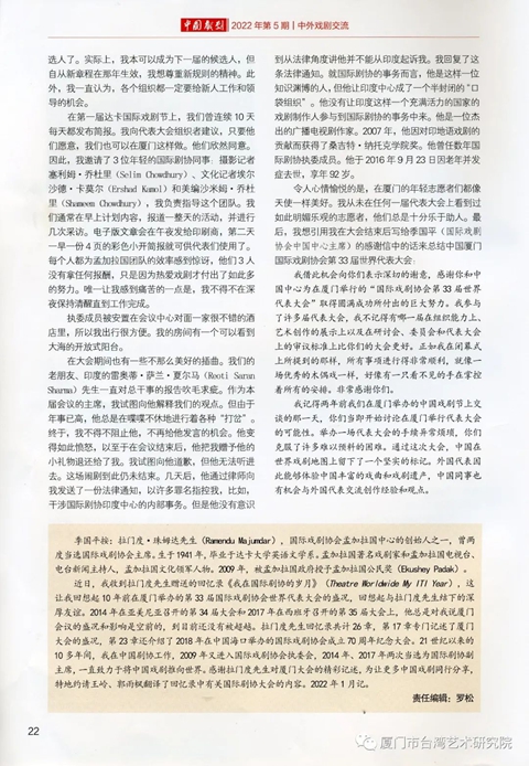 近日,国际戏剧协会前主席拉门度·珠姆达(Ramendu Majumdar)在《中国戏剧》2022年第5期发表文章《叹为观止的中国厦门》,回忆2011年9月19日至25日国际戏剧协会第33届世界代表大会在中国福建省厦门市举办的盛况。