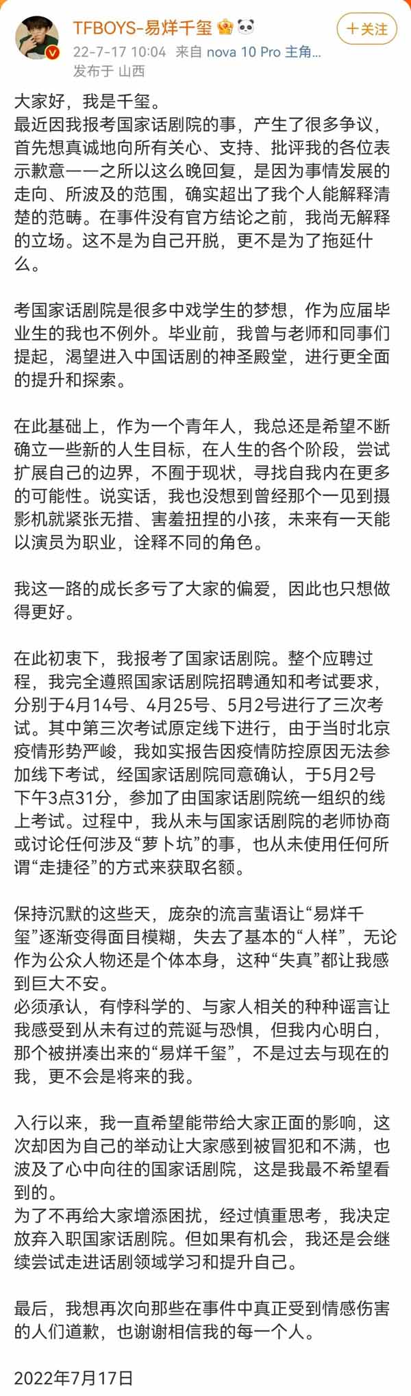 7月6日,中国国家话剧院公示了2022年应届毕业生招聘拟聘人员名单,其中知名艺人易烊千玺、罗一舟、胡先煦在列,此名单引起网友们的极大关注。刚刚,易烊千玺本人在其微博上发文回应考编争议,“经过慎重思考,我决定放弃入职国家话剧院。但如果有机会,我还是会继续尝试走进话剧领域学习和提升自己。”