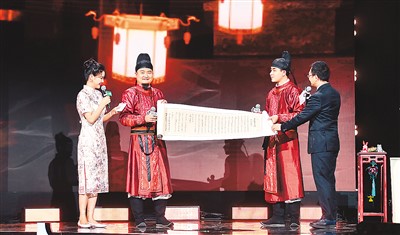 抖音民乐主播“大唐芙蓉园东仓鼓乐”在晚会现场展示、介绍工尺谱。主办方供图