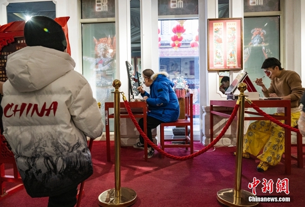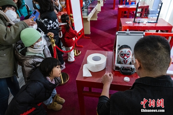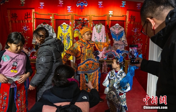 1月24日,中国农历癸卯兔年正月初三,北京市前门鲜鱼口的天乐园大戏楼内,小朋友在此近距离观摩体验京剧国粹,用传统文化充实春节假期。图为小朋友们在小戏台上体验京剧扮相。 中新社记者 侯宇 摄