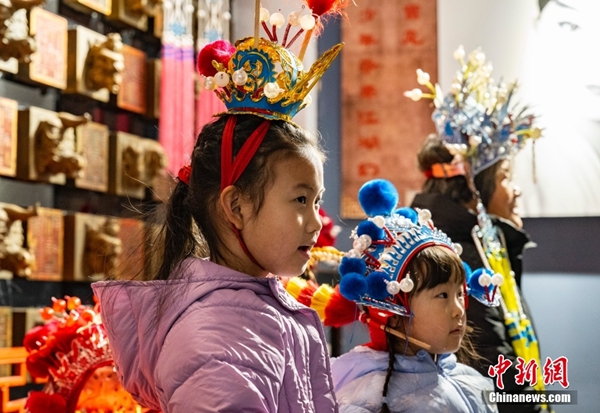 图为小朋友们体验部分京剧服饰。 中新社记者 侯宇 摄