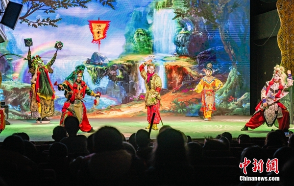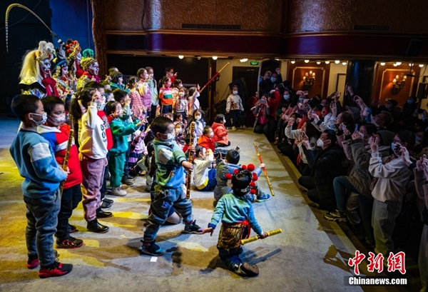 图为小朋友们参与改编京剧《大闹天宫》的登台互动环节。 中新社记者 侯宇 摄