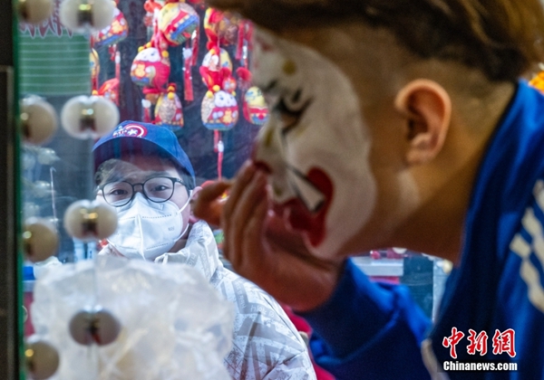 图为户外途经的一名小朋友被室内正在化妆扮相的京剧演员吸引。 中新社记者 侯宇 摄