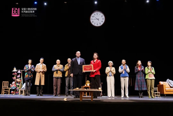 中国文联党组成员、副主席俞峰为话剧《民生巷11号——之二》颁发首届全国小剧场戏剧“紫金杯”优秀剧目展演“优秀剧目”奖。