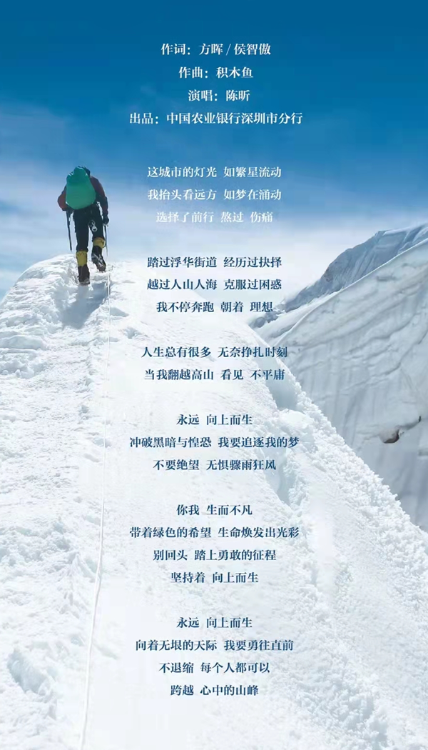 《向上而生》一方面描述城市里的奋斗者含坚持传递的"向上的力量",为实现梦想克服困难、坚定前行、突破自我,跨越心中的山峰;另一方面也展现了敢于造梦的人的成长,助力美好生活而不断开拓创新的精神,和"不畏艰险、勇攀高峰"的精神风貌。