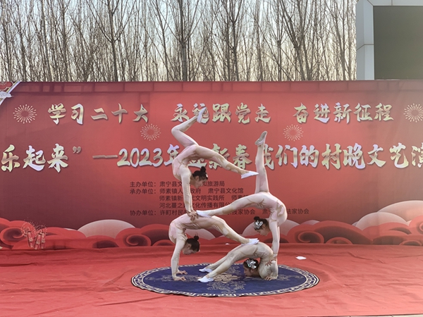 2023年1月1日至2月5日“双节”期间,河北省杂技界广泛开展“我们的中国梦——文化进万家”活动。通过线上线下相结合、集中与分散相结合的方式,为基层群众倾情奉献精品杂技大餐,丰富了广大基层群众“双节”期间文化生活,满足了人民群众精神文化生活需求,营造了良好的节庆氛围。