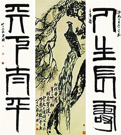 去年的春拍市场上,最受瞩目的拍品当属齐白石最大尺幅作品《松柏高立图·篆书四言联》(俗称“大老鹰”)。2011年5月,齐白石的《松柏高立图·篆书四言联》从8800万元起拍,最后以3.7亿元的落槌价被买走,加上15%的拍卖佣金,最终总成交价为4.255亿元,刷新了全球中国近现代书画成交纪录。这件作品更是让齐白石登上了近现代艺术天价王的第一宝座。