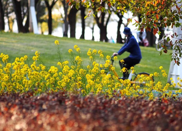 2020年3月15日,游客在上海后滩湿地公园骑行。