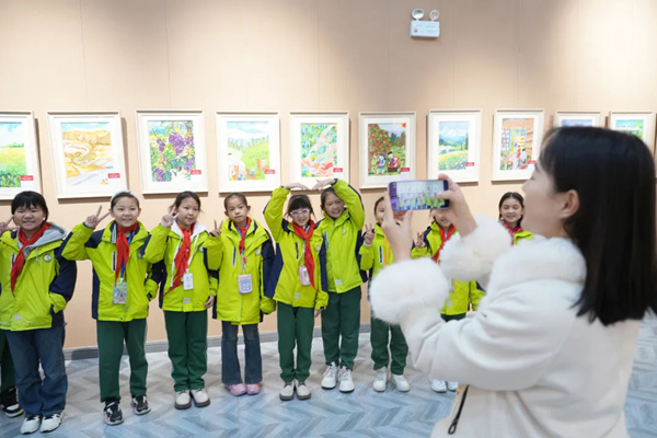 11月15日,“童绘新疆”中小学生绘画作品巡展第三站在塔城地区美术馆开幕,学生们在画作前合影。(摄影:马合巴勒·木尔扎汗)