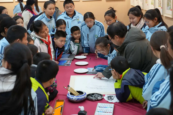 “你看,这幅《未来城市》画得多好啊!满满都是未来科技的炫酷感,我一定好好学习,将来把我们的城市建设得像画中一样智能先进。”参观画展的塔城市第六中学八年级十班学生热佩克·依沙木丁满怀憧憬地说。 “我最喜欢《石榴籽一家亲》这幅作品,你看画中各族小朋友笑容灿烂,小手紧紧相牵,围绕着那颗鲜红的石榴,生动展现了中华民族大家庭的和谐与团结。小朋友们恰似那紧密相依的石榴籽,寓意着‘中华民族一家亲’,让人深切感受到民族团结的美好与力量。”塔城市第五小学美术教师高雪梅说。 “这是童绘画作第二次走进塔城,四年来孩子们的绘画审美能力和创造力有了很大提升。”新疆美术家协会美术教育委员会常务副主任崔逢春表示,通过新疆学习平台每一季精心策划的童绘主题,孩子们不仅用画笔勾勒出对家乡的依恋、对祖国未来的无限憧憬,更在创作过程中将中华优秀传统文化的精髓与魅力融入其中,让这份传承与创新在他们笔下熠熠生辉。 “‘童绘新疆’巡展是一次非常有意义的活动,孩子们的绘画作品充满感染力,他们表达着最真挚的情感、最动人的故事。活动激发了孩子们对艺术的兴趣和热情,同时也对他们未来的成长和发展很有助益。”塔城地区美术馆馆长禹海珠说。 11月15日,“童绘新疆”中小学生绘画作品巡展第三站在塔城地区美术馆开幕。在画展现场的“童绘新疆”小课堂上,崔逢春老师与孩子们共同创作国画作品。(摄影:马合巴勒·木尔扎汗) “童绘新疆”是新疆学习平台打造的青少年“筑基”工程品牌活动。孩子们在“畅想二〇三五”中遨游未来世界,感受科技带给生活的美好;在“二十四节气”中回顾中华民族传统农耕社会的生活经验和文化记忆;在“我们的节日”里感悟传统节日的千年根脉、人民精神、时代意义;在“甜美之乡”品味甜蜜蜜的味道、美滋滋的感觉、热腾腾的生活、沉甸甸的收获。四年来,全疆各族小朋友投来三万余幅画作,通过画笔描绘出对家乡、对祖国的热爱和展望,展示出对中华优秀传统文化的传承和弘扬。 此次“童绘新疆”巡展不仅是一次艺术上的交流和展示,更是一次深刻的爱国主义教育。在画展现场的“童绘新疆”小课堂上,崔逢春老师与孩子们共同创作了国画作品《小白杨哨所》。孩子们用画笔在宣纸上勾勒出小白杨哨所的轮廓,每一笔都凝聚着他们对作品的专注与热爱。在享受艺术创作乐趣的同时,孩子们也在心中播下了爱国情怀的种子。 此次画展将持续至11月24日结束。随后两百幅作品将在和田地区、喀什地区等地进行巡展,展期各10天。