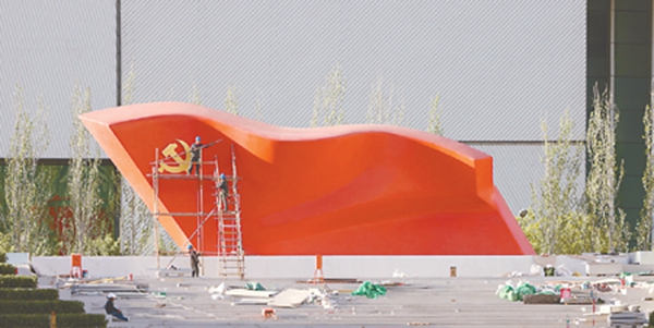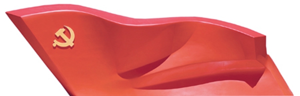 雕塑《旗帜》,以深刻反映“旗帜就是方向,旗帜就是力量”为主要内涵,通过塑造一面迎风招展、气势如虹的中国共产党党旗,形象展示中国共产党高举马克思主义、中国特色社会主义伟大旗帜,更加自觉地增强道路自信、理论自信、制度自信、文化自信,既不走封闭僵化的老路,也不走改旗易帜的邪路,保持政治定力,坚持实干兴邦。雕塑整体造型庄重朴素,与环境和谐一体,红色的旗帜、绿色的植物、白色的汉白玉基座与台阶,三色相得益彰、相应成趣,做到了与中国共产党光荣的百年历史相契合,与朴实、厚重、崇高的美学精神相契合,与新时代精神相契合,与展馆环境、建筑相契合。这是中国共产党的标志,象征着全体共产党员立志不忘初心、牢记使命,以永不懈怠的精神状态和一往无前的奋斗姿态,继续朝着实现中华民族伟大复兴的宏伟目标奋勇前进。