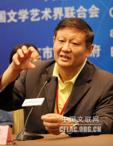 7月29日,2009年北京世界魔术大会举办期间第四次新闻发布会举行。图为中国杂协分党组书记、副主席林建在发布会上介绍大会情况。中国文联网 余宁摄影报道