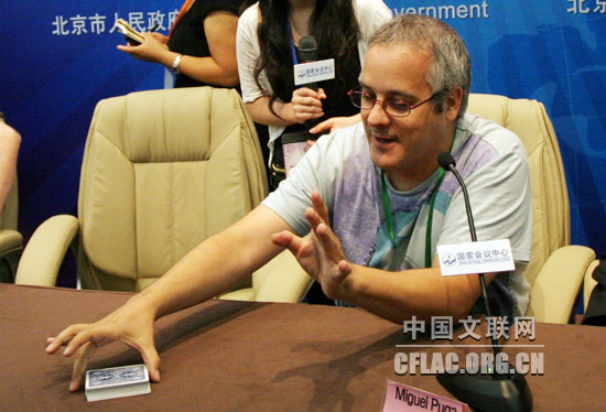 7月29日,2009年北京世界魔术大会举办期间第四次新闻发布会举行。图为著名魔术师米格在发布会现场表演魔术。中国文联网 余宁摄影报道