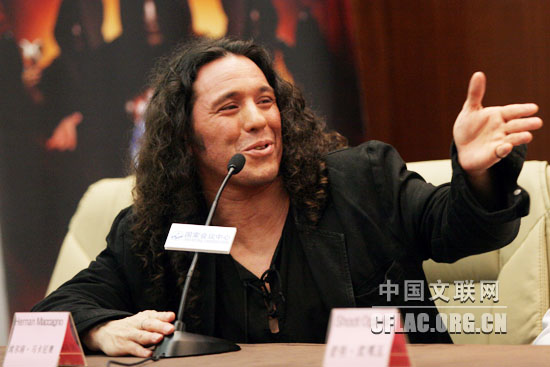 7月29日,2009年北京世界魔术大会举办期间第四次新闻发布会举行。图为著名魔术师欧嘎瓦回答记者提问。中国文联网 余宁摄影报道