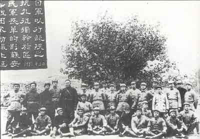 红军长征中(1935年3月至5月)单独行动的红9军团部分干部到达陕北后于延安合影(后排左起第5人为军团长罗炳辉、前排左起第3人为军团政治委员何长工)。