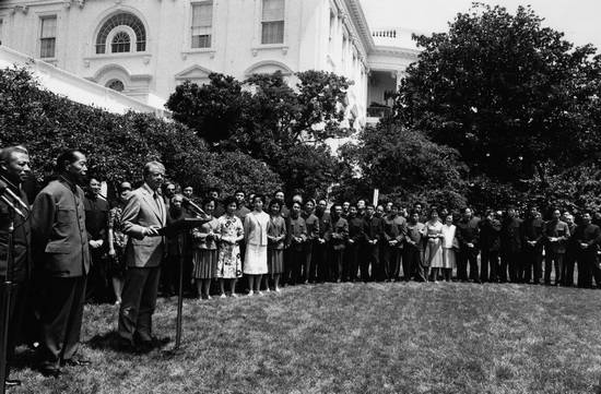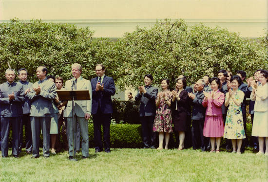 美国总统卡特在白宫玫瑰园接见中国艺术团全体成员并讲话