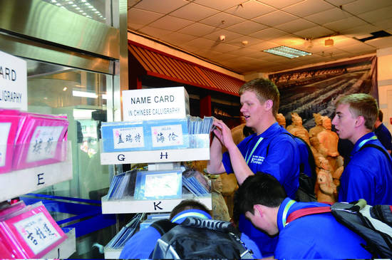 在月坛体育馆,舞蹈演员乔丹·沃尔德跑上前来,跟记者说:“我认识你,昨天咱们曾在一起,你给我们拍照,很高兴认识你。”此时,他正跟他的中国伙伴毛少鹏在踢球,跟他们在一起的还有康纳·格西里和乔丹·维勒,后者更被大家戏称为“乔丹三世”。这一天,他们彻底放松了,尽管此后几天的行程非常紧,他们似乎更享受融入北京的感觉。“北京很繁华,很漂亮”,这是他们的普遍感受。在餐馆里,中国孩子们向美国伙伴介绍酸梅汤,乔丹·沃尔德好奇极了,不明白这种“用乌梅做成的可口可乐”为什么这么好喝。