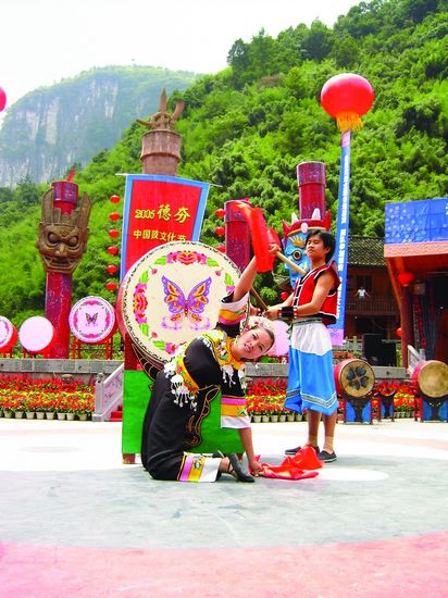 德夯苗寨里的妹伢子,人人六七岁开始学打鼓,鼓也是缺乏娱乐的大山里面孩子们最好的玩伴。与鼓经年累月的相伴,使一个好的鼓手跳鼓舞时往往能进入一种人鼓合一的境界。山寨间行走,随时随处可听到苗鼓“咚咚咚”敲打的鼓点声。特别是到了“三月三”苗族歌舞节、“四月八”亚努节、立秋时的“赶秋节”,还有“六月六”苗族人纪念先祖,便有成千上万的苗族人盛装聚集,载歌载舞,只见人影晃动,花团锦簇,歌音袅袅,笑语盈盈,十分热闹。数十面大红鼓同时敲响,人影翻飞,鼓声震天,更是壮观。
