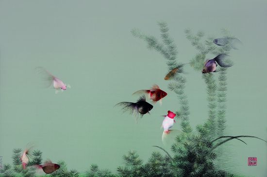 双面绣金鱼是传统苏绣的代表作,以精细、雅洁、鲜活而驰名。运用不同的针法表现金鱼、水草的不同质感;用线极细,鱼尾部用以“微米”计算的细线绣制而成,将蝉纱似的金鱼尾巴表达得惟妙惟肖。画面中,一群形态各异、追逐嬉戏的金鱼被姚建萍的飞针走线刻画得生动活泼,充满了灵动的情趣。