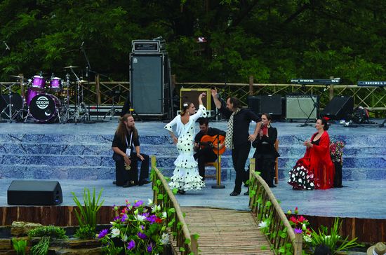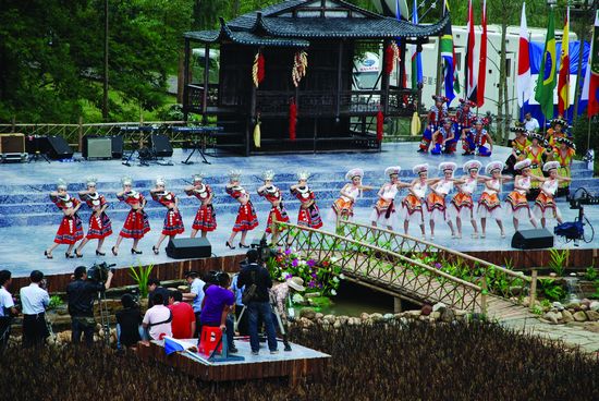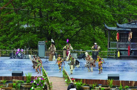 Windmills turned slowly to the accompaniment of the gurgling of stream, while the sound of songs was floating in the air. The opening ceremony of 2011 Zhangjiajie International Country Music Week was held in the pastoral scenic spot of the picturesque Yellow Dragon Cave Plaza. The ceremony itself overawed the audiences by displaying the remarkable aspects of the Music Week. The 2nd Country Music Week had the theme of "Our Country Music: World Natural Heritage", whose purpose was to exhibit the folk country music of different nations all around the world and carry out the exchange between them in order to promote the cultural development of world nations.