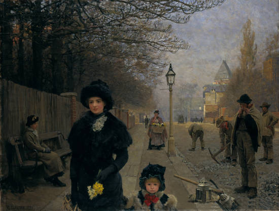 This exhibition ranged from traditional paintings to those avant-garde works and involved mainstream as well as rebelling schools. As to variety of painting schools, the theme and category can vary from traditional history and religion to the two most familiar types—portrait and landscape and then to the vivid description of ordinary British people’s life. George Clausen, who dwelled in Hampstead for a decade from 1877, created lots of works related to London. His works in 1881 titled Spring Morning: Haverstock Hill was exhibited, in which a road steadily started its way from downtown of London up to Hampstead that used to be a suburb. On both sides of this simple but graceful road stood those spacious villas built in the late 19th century. In the process of urbanization in the 18th and 19th centuries, the British bourgeoisies gradually came into existence and took shape at the mid 19th century. Along with considerable revenue, some moved to the suburb constantly in order to evade pollution in the downtown and pursue privacy, which greatly expanded the coverage of British cities to suburb. Then economic leap, population boom and privacy priority led to many villa zones in the suburb of London. With its unique art language, this painting enabled the current audiences to know more about the real life of varied British people at that time.