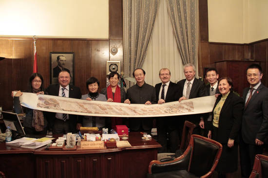 At the end of meeting, both parties exchanged gifts. Yang Chengzhi presented the exquisite Scroll in Silk and Colorful Painting Palace Museum, and attendees from both countries took a group photo as memoir.