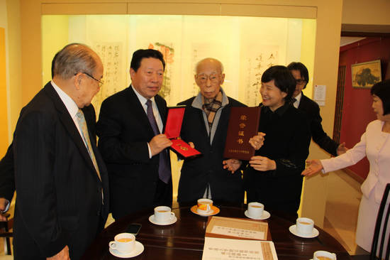 孙家正向饶宗颐颁发中国文联荣誉委员证书与金质 证章