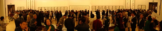 When spectators waiting for the opening ceremony, the artist in black wind coat and with long hair floating in the air, walking with vigorous strides-- Mr. Shi Hu said loudly: “My works and I welcome you.” then waving his hand, “Please!” turned back and got into the hall of display. There was no time to react, spectators followed him rush into the hall. All the celebrities of painting and calligraphy were as same as the spectators, so there were only the art works and spectators here.