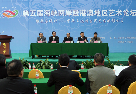 自古燕赵多慷慨悲歌之士,“风萧萧兮易水寒,壮士一去兮不复还”——荆轲刺秦王的悲壮之举在燕赵大地上广为流传,而曾经作为清朝行宫的古之热河、今之承德,作为燕赵大地一隅,虽然至今已过去几百年,却依稀可以想见八旗骑兵策马奔腾、木兰秋的壮观景象,10月14日,由中国文联、河北省委宣传部主办,河北省文联、承德市人民政府承办的第五届海峡两岸暨港澳地区艺术论坛在这里隆重开幕。