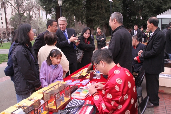 Situated in the middle of California State, Sacramento is the location of the State Government, with a small population of hundreds of thousands and beautiful scenes. The opening ceremony of the Culture Week was simple but solemn, enthusiastic but not noisy. After the opening ceremony, the Chinese folk artists started their demonstration calmly without deliberate arrangements. At beginning, only some office workers passed by occasionally with a curious glimpse. But after a while, the passionate Americans were gathered by the charm of Chinese traditional handicrafts. They curiously watched the demonstrations and whispered their questions to the folk artists, many of whom even wanted to take a brave try of making the painted face clay sculpture of Beijing Opera, shadow puppet and sugar paintings. Mr. Deng Lifeng said they had organized various culture exchange activities and always felt that there was too much good stuff of Chinese culture waiting them to introduce to the American audience, which may help Americans to understand the real Chinese culture.